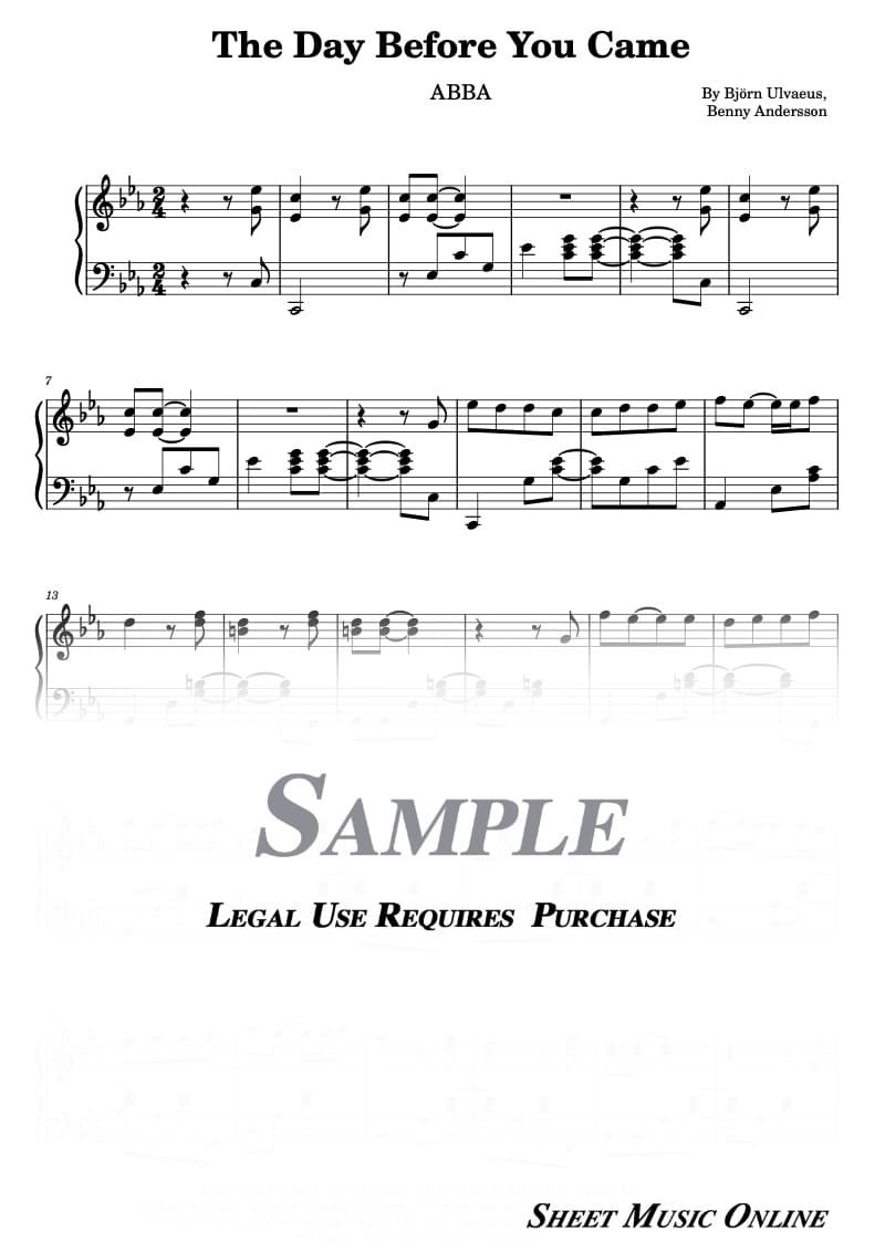 Relive the elegance of ABBA’s 1982 classic “The Day Before You Came,” arranged for solo piano. Set in C minor, this pop–disco ballad captures the band’s signature melodic style with emotional depth and nostalgic charm. Perfect for intermediate pianists who love timeless hits from the ’80s. Includes 6 pages in high-quality PDF format for instant digital download.