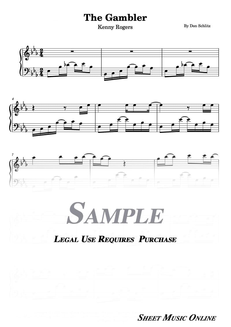 Play the legendary country classic “The Gambler” by Kenny Rogers, arranged for solo piano. Set in E♭ major, this 1977 hit blends storytelling lyrics with memorable melodies, making it a timeless favorite in the country music genre. Perfect for intermediate pianists who want to capture the spirit of Rogers’s iconic performance. Includes 7 pages in high-quality PDF format for instant digital download.